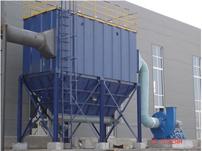 在风机的作用下,含尘气体由风管进入除尘器设备内部,粗颗粒的粉尘在惯性碰撞和重力的作用下,落入灰斗内部,细颗粒的粉尘则随着气流通过滤袋被阻挡在滤袋的外表面,净化后的气体经 排风机排出设备外部。避免了高速含尘气流直接冲刷滤袋,从而延长了滤袋的使用寿命,提高收尘的效率。随着过滤工况的进行,滤袋外表面的粉尘则越积越多,因此滤袋的阻力也随之增大,当阻力达到   范围时,由控制仪控制的清灰则开始对滤袋进行清灰处理,*设备的除尘*。