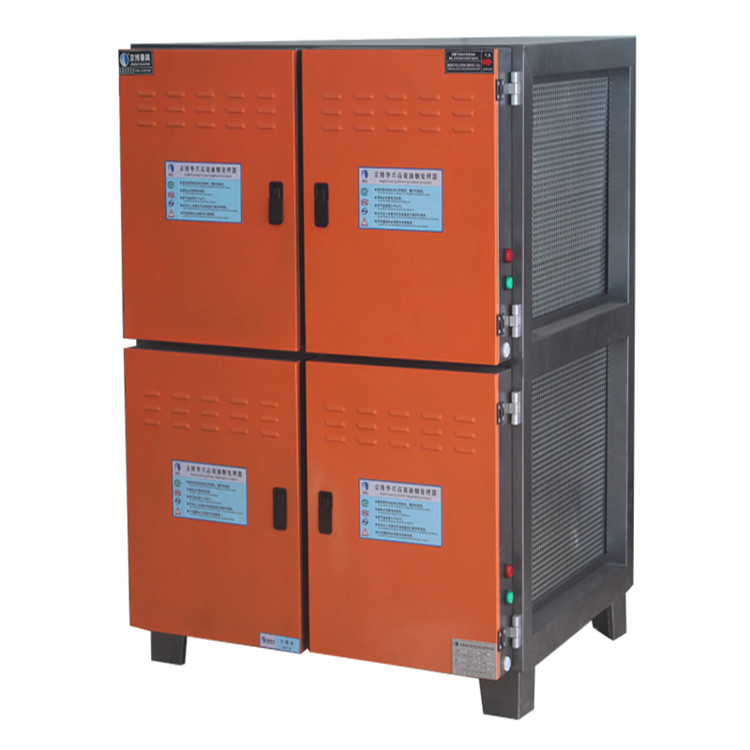 油烟由风机吸入静电式油烟净化器,其中部分较大的油雾滴、油污颗粒在均流板上由于机械碰撞、阻留而被捕集。当气流进入高压静电场时,在高压电场的作用下,油烟气体电离,油雾荷电,大部分得以降解炭化;少部分微小油粒在吸附电场的电场力及气流作用下向电场的正负极板运动被收集在极板上并在自身重力的作用下流到集油盘,经排油通道排出,余下的微米级油雾被电场降解成二氧化碳和水,zui终排出洁净空气;同时在高压发生器的作用下,电场内空气产生臭氧,除去了烟气中大部分的气味。